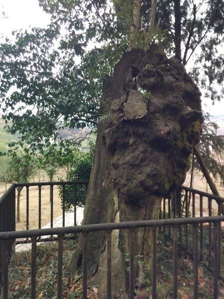 在山脚下我们能看到一株古木为乌储树,它已有五百多年的历史了。此树因受雷击而只剩树杆,当地村民确认它已死。时隔已久,不知何年却见残桩上又长出了新枝,称为一绝,于是后人题“树神”二字以示敬畏。大家仔细看,此树像不像一位姑娘伫立道旁迎候川流不息的游人?
